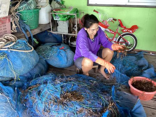 🦀🛳️กลุ่มอวนปู มีสมาชิกกลุ่มจำนวน 5 คน โดยมุ่งเน้นการนำเงินทุนไปใช้ในการประกอบอาชีพจัดหาอุปกรณ์ ประเภทอวน มาใช้ในการทำประมง เพื่อเพิ่มยอดขายและพัฒนาต่อยอดโครงการอวนปู ตลอดจนส่งเสริมการรวมกลุ่ม การบริหารจัดการที่มีประสิทธิภาพ และการพึ่งพาตนเองของสตรีในพื้นที่ ซึ่งผลผลิตที่ได้จากการประมงวางอวนปู ได้แก่ ปูม้า ปูตายาวนำไปขายให้กับโรงแรมที่พัก รีสอร์ท หรือร้านค้าต่าง ๆ สร้างรายได้ให้กับครอบครัว